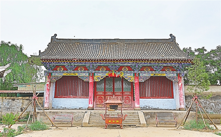 村委東院就是坐北朝南的關(guān)帝廟,始建于清晚期,進(jìn)深四椽,正殿磚砌臺基,面寬三間,單檐懸山頂,五檁前出廊式梁架,柱頭斗公式三踩單昂,明間設(shè)四扇六抹隔扇門,次間設(shè)直欞窗。殿中有關(guān)帝坐像,神閣前是一長條供桌和香爐,關(guān)平、周倉分立兩旁。正殿兩旁各一耳房,東西各兩間上廂房緊挨著兩間下廂房,下廂房比上廂房低一尺多。院兩側(cè)有鐘鼓樓。關(guān)帝廟西有一小院,有正房、西房,供財神、河神。