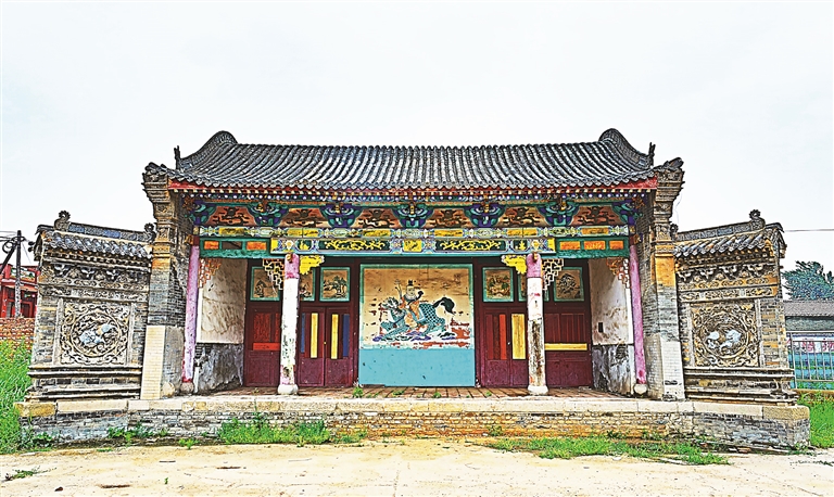 關(guān)帝廟正對面坐南朝北一座樂樓,是同治八年村長郭師揚(yáng)組織修的,奇特的是樂樓后墻開有九座洞龕。村里人便編了一句順口溜:“郭師揚(yáng),瞎胡鬧,戲臺修了九眼窯?!惫毂蠹m正道,“郭師揚(yáng),生得傲,戲臺修了九眼窯?!笨傊?,樂樓設(shè)計雖然奇特,但不方便演員化妝,在使用功能上屬于敗筆。不過樂樓整體看雕梁畫棟,東西墻上有壁畫,墀頭為花卉及麒麟磚雕,兩側(cè)有八字影壁,有椽飛、斗公式、琴棋書畫精美磚雕,也算是給后人留下的寶貴財富。