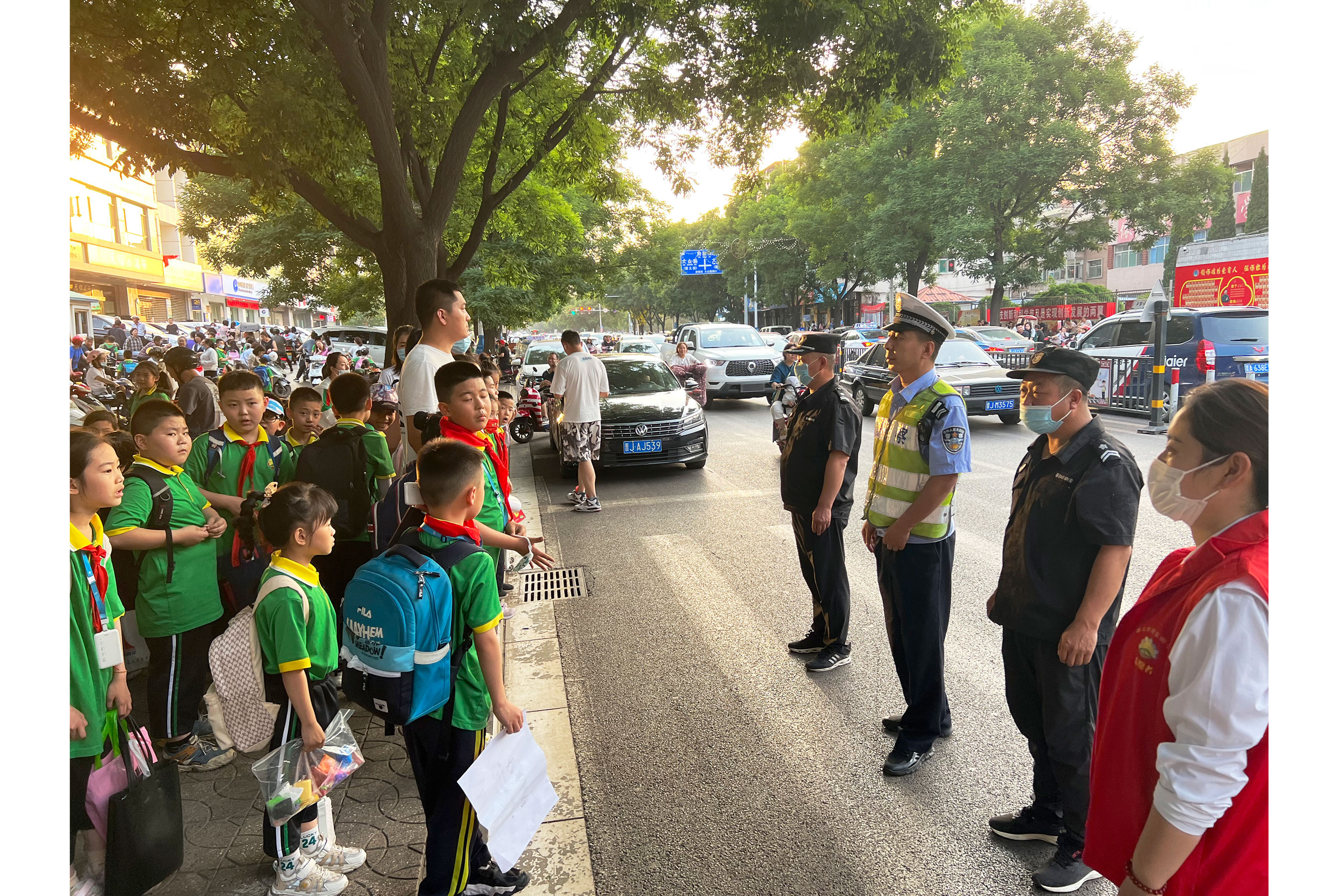 由交警、義警、家長志愿者等組成的護學崗正在執(zhí)勤