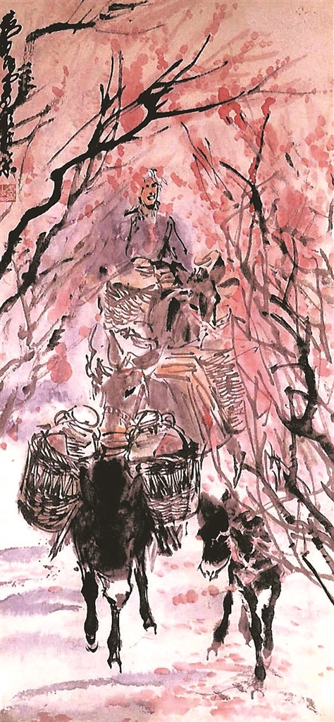 我沉思片刻,想到近年來到杏花村采風(fēng)、旅游、品美酒的畫家不少,大多以杏花、汾酒為題材寫生作畫。大約70年代左右比較有名畫家之一是黃胄先生。汾酒博物館收藏有黃胄的一幅精心之作《馱酒圖》,題材來自于生活,對(duì)送酒工的寫實(shí)畫。作品以騎驢的送酒工為畫眼,驢群馱著杏花村的美酒,穿過茂密的杏林。