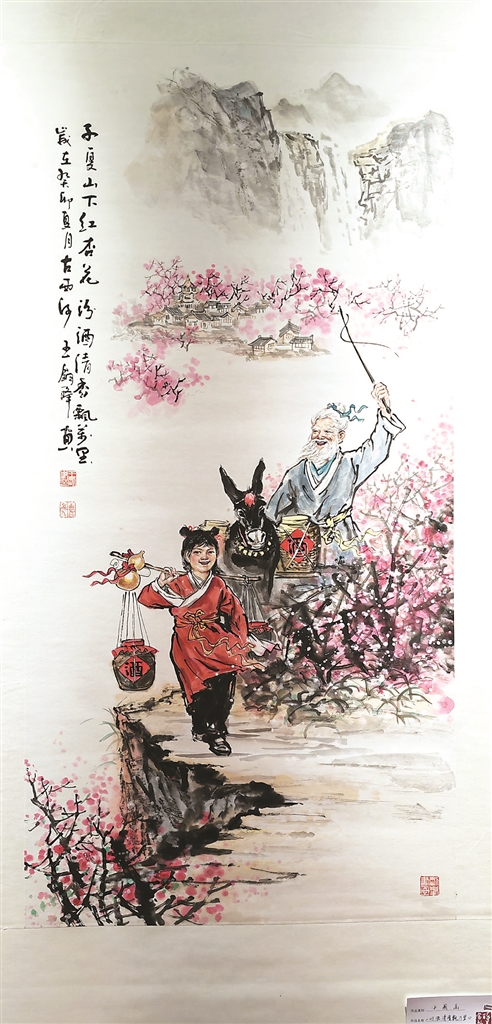 我反復(fù)觀看畫作,只見畫面構(gòu)圖布局合理,遠(yuǎn)景、近景濃淡變化自然。主景人物老人、小孩面帶淺笑,平淡地放射著沽酒后發(fā)自內(nèi)心的陽光和歡喜,也有種從容、淡定、自信自足的氣息。老人紅潤(rùn)的臉色,胡須像銀絲一樣有光,一手揚(yáng)鞭,驅(qū)趕著毛驢快跑,小孫兒肩挑酒簍走在前面。配景杏花盛開粉白相間,遠(yuǎn)處的酒家依稀可見。畫中題款“子夏山下紅杏花,汾酒清香飄萬里”點(diǎn)出了畫的主題。