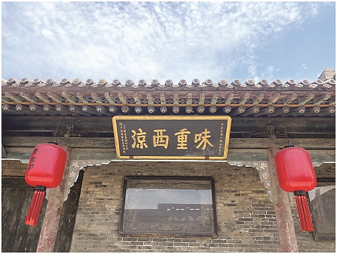 順著正房發(fā)酵房走到了西偏院有一口古井亭,亭曰“申明亭”亭內(nèi)有傅山題字“得造花香”。申明亭旁的小院門出來便是老作坊的“售酒店鋪”,門店屋檐下有四塊匾額,分別題寫著“中外馳名”“名聞海外”“名震四?!焙汀拔吨匚鳑觥?。一間會(huì)客廳里,還用銅像還原了楊得齡與名人交談場(chǎng)景。引來八方游客,眾人不僅對(duì)汾酒老作坊所產(chǎn)白酒感興趣,還對(duì)懸掛的匾額感興趣,特別是“味重西涼”匾,許多游客對(duì)該匾的解讀也是多有疑問,我從以下幾方面進(jìn)行解讀。