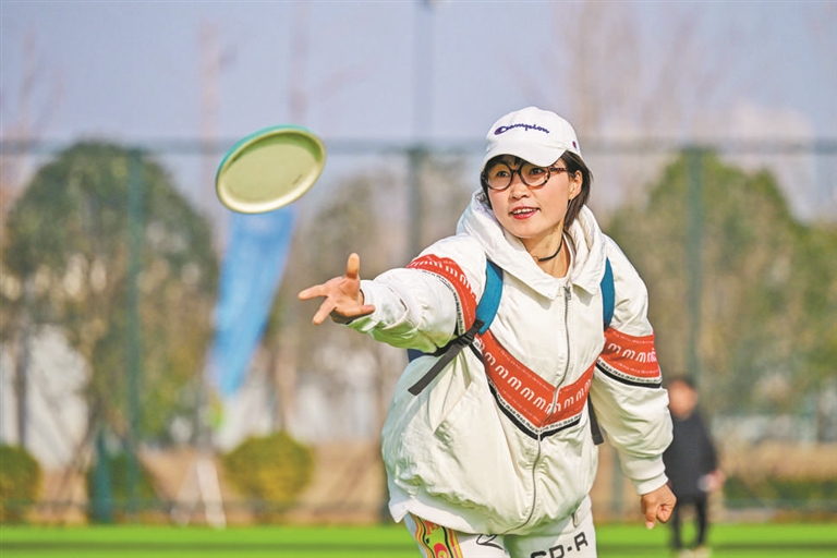 圖⑤河南洛陽,市民體驗(yàn)飛盤運(yùn)動(dòng)。