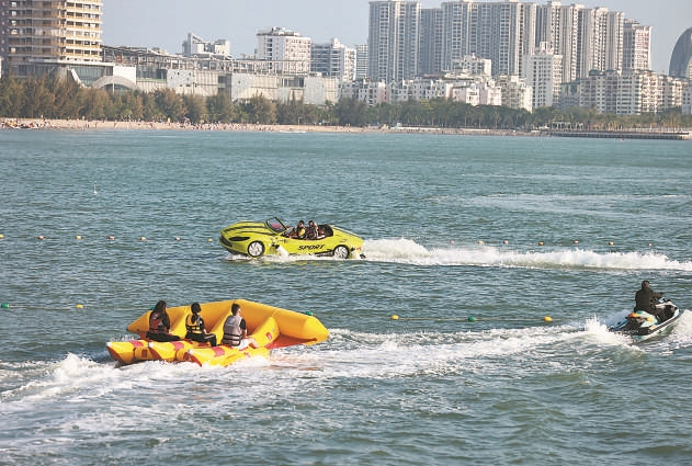 圖⑧海南三亞,游客在海月廣場附近海域體驗(yàn)海上運(yùn)動(dòng)項(xiàng)目。