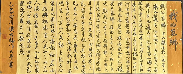 我的家鄉(xiāng)方山縣,位于山西省呂梁山麓,黃河流域中段。境內(nèi)七大溝橫臥東西,一條大川縱貫?zāi)媳?。?guó)家級(jí)風(fēng)景名勝區(qū)北武當(dāng)山,雄奇險(xiǎn)秀,松濤陣陣,笑迎八方游客。清澈蜿蜒的北川河,呼嘯奔騰,滔滔不絕,呼喚四海賓朋。橫泉水庫(kù),碧波漪漓,宛如明鏡,鑲嵌在家鄉(xiāng)腹部,庫(kù)區(qū)飛鳥(niǎo)翔集,魚(yú)兒戲水,岸草青青,楊柳郁郁。千年民居張家塔,青磚黛瓦,鱗次櫛比,點(diǎn)綴在黃土高坡。美麗鄉(xiāng)村韓莊、嶺上、劉家莊,爭(zhēng)奇斗艷,各具特色,田園風(fēng)光,令人留戀。一代廉吏于成龍,生長(zhǎng)于斯,名揚(yáng)天下,廉潔精神留傳至今。