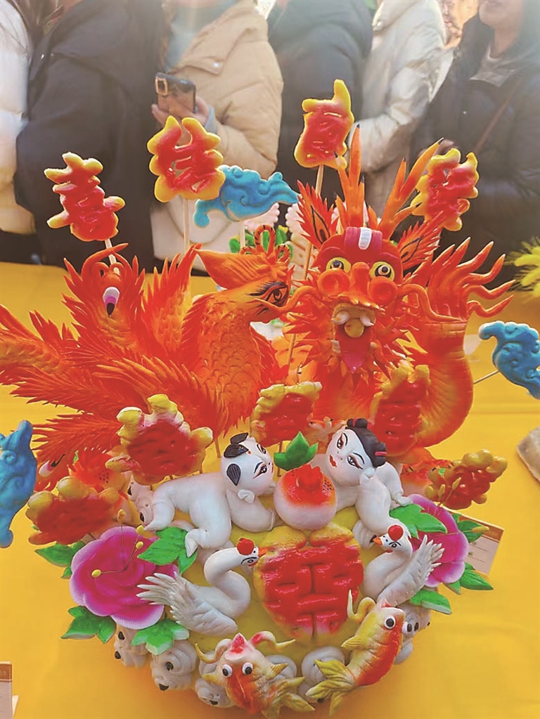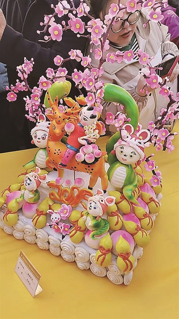 嵐縣面塑的分類細致入微,風格迥異,可分為三大類:其一是點飾祈福,如象征婚育繁衍的羅漢漢、爬孩孩,象征幸福生活蒸蒸日上的棗山;其二是簡飾美食,如年節(jié)兒童食品蛇燕燕、花卷卷、紅點年饃;其三是裝飾展示,美吃美看,營造氛圍,如用于喪葬祭祀的八仙過海,用于喜慶祝壽的喜鵲登梅等。隨著時代的發(fā)展,藝人們還在面塑作品中增加了具有時代性、創(chuàng)新性的內(nèi)容,如黑神話悟空、魔童哪吒等,讓古老的面塑煥發(fā)出新的活力。