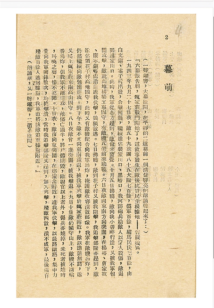 興縣檔案館的案卷柜里,一卷泛黃的劇本靜靜地躺在檔號(hào)為1-1-632的檔案盒中。由晉綏邊區(qū)呂梁文化教育出版社出版的《甄家莊戰(zhàn)斗》話劇劇本,鉛字在時(shí)光里褪色,卻仍能讀出嚴(yán)寄洲筆下那股悅動(dòng)的硝煙。那是1943年秋天,甄家莊的山崗上,槍與筆共同篆刻的傳奇。這部“七七七”文藝獎(jiǎng)金獲獎(jiǎng)作品,通過(guò)藝術(shù)再現(xiàn)了晉西北反掃蕩模范殲滅戰(zhàn)——甄家莊戰(zhàn)斗。