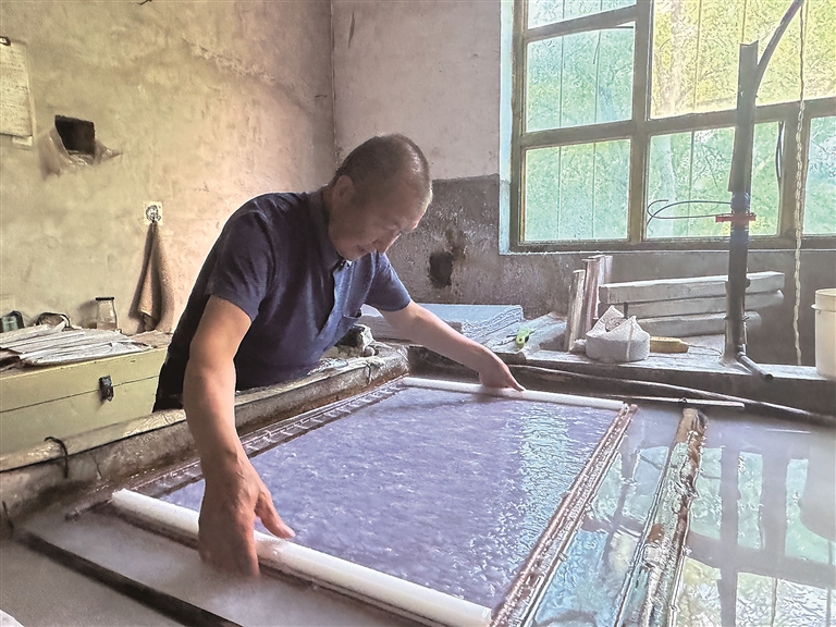 “每張紙需連續(xù)撈兩次,第一次為‘頭簾水’上漿,稍作停留,挑凈雜質(zhì),第二次‘二簾水’重復(fù)第一次的挖水動作,補漿平整。”王建國一邊向記者介紹,一邊熟練地將竹簾順著胳膊擺動在水里上下起落,力道勻得像秤稱過。至此,一次抄紙便成了。