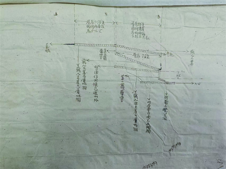 白家墕地洞打得較好。在今年一月份敵人大掃蕩的那次,老百姓四處逃跑,這使得老百姓有的逃到河西,有的跑到敵占區(qū)附近,有些老百姓和民兵不愿意跑,即藏該村舊地洞中。一月七日,敵就來這個(gè)地洞內(nèi),老百姓把鍬镢頭一齊舉動(dòng),亂砍亂響,叫喊時(shí)很高,敵人在外面就說:“這里有機(jī)關(guān)槍,八路軍,不敢過去。”敵人走了老百姓就商量,今后要在這就得把地洞修理一下,回來商量就開始了。在十二丈高崖的半山中間,開著洞口先往地下打,六七丈高,然后開口,開口一丈多深,就向上打了二丈深的胡蘿卜窯洞則,然后一面平平向后。打了十二丈,旁邊打了橫窖則八個(gè),向外打出兩個(gè)口子,一為槍眼,亦頂氣眼。一為廁所,又頂個(gè)槍眼,高四尺五丈,這個(gè)工程還不大,每天四個(gè)工,共打了卅二天,合計(jì)為一百八十個(gè)工。
