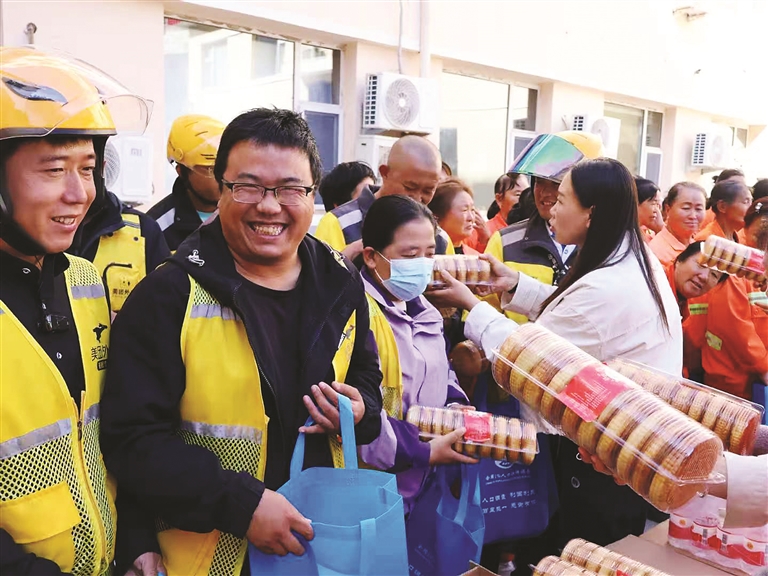 活動當(dāng)天,社區(qū)工會驛站內(nèi)處處洋溢著溫馨氛圍。社區(qū)工作人員提前將印有“致敬城市服務(wù)者”字樣的定制月餅整齊擺放,從禮盒分裝到現(xiàn)場引導(dǎo),每一個環(huán)節(jié)都細(xì)致入微,只為等候一線勞動者的到來。下午3時許,身著橙黃色工裝的環(huán)衛(wèi)工人、肩挎工作包的外賣員與快遞員、剛結(jié)束午高峰運營的出租車司機(jī)們陸續(xù)抵達(dá),工作人員立刻上前熱情迎接,雙手遞上月餅禮盒,輕聲叮囑:“師傅們平時為了社區(qū)整潔、居民便利辛苦奔波,中秋快樂!國慶快樂!這點心意請您收下?!?/p>
