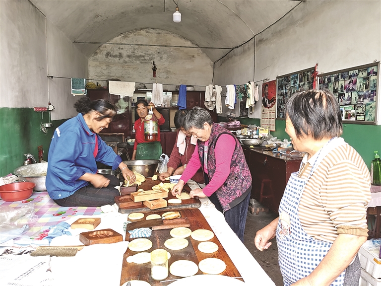 圖為孝義市兌鎮(zhèn)鎮(zhèn)后莊村侯秋花、薛孝蘭、王秀芝等正在制作月餅。 李竹華 攝