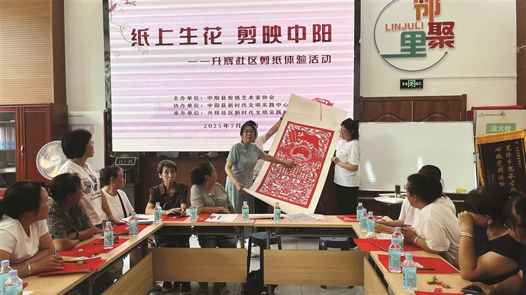 2025年7月25日,由中陽縣剪紙藝術(shù)家協(xié)會(huì)主辦、升輝社區(qū)文明實(shí)踐站承辦的“紙上生花·剪映中陽”非遺體驗(yàn)活動(dòng)成功舉辦。30余名居民在崔春梅的指導(dǎo)下,系統(tǒng)學(xué)習(xí)剪紙的歷史脈絡(luò)、藝術(shù)特色與實(shí)操技藝,創(chuàng)作出多幅生動(dòng)作品。活動(dòng)顯著增強(qiáng)了居民對(duì)本土文化的認(rèn)同與自豪,提升了社區(qū)凝聚力。隨后,鋼城社區(qū)也復(fù)制并拓展了這一模式,進(jìn)一步驗(yàn)證其在基層推廣中的適應(yīng)性與實(shí)效性。