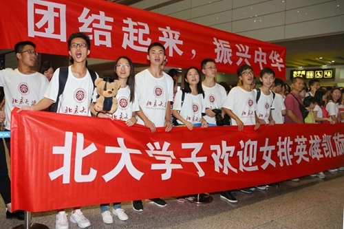 2016年,北大學(xué)子在機(jī)場(chǎng)迎接女排隊(duì)員回國(guó),再次豎起了“團(tuán)結(jié)起來(lái),振興中華”的口號(hào)。