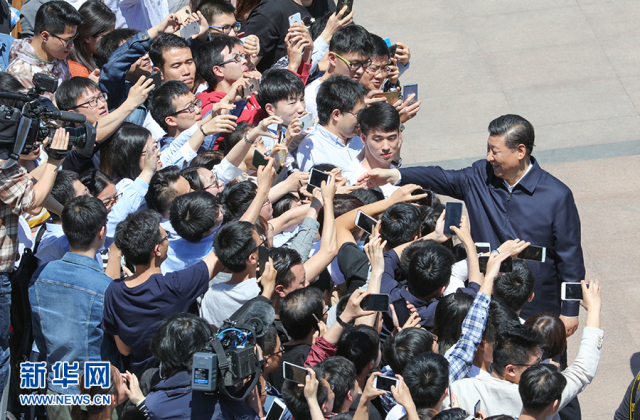 2018年5月2日,中共中央總書(shū)記、國(guó)家主席、中央軍委主席習(xí)近平來(lái)到北京大學(xué)考察。這是習(xí)近平離開(kāi)學(xué)校時(shí)同道路兩旁師生親切握手。新華社記者王曄攝