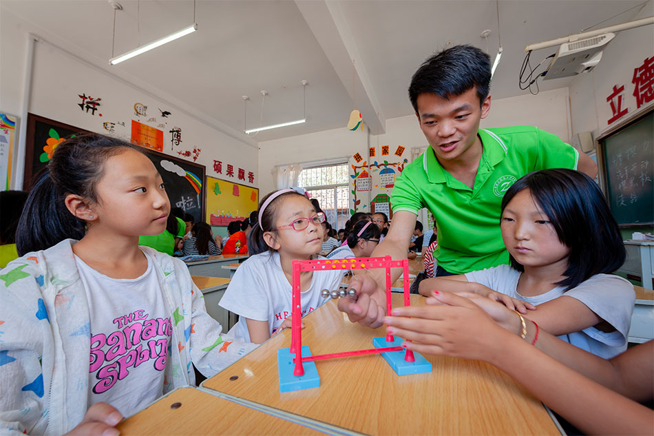 大學(xué)生正在為孩子們演示潛望鏡的原理。記者 劉亮亮 喬鵬華 攝