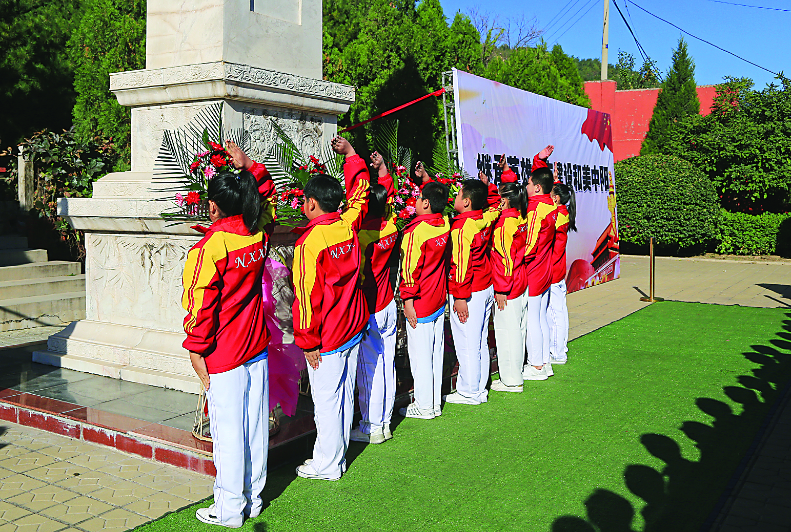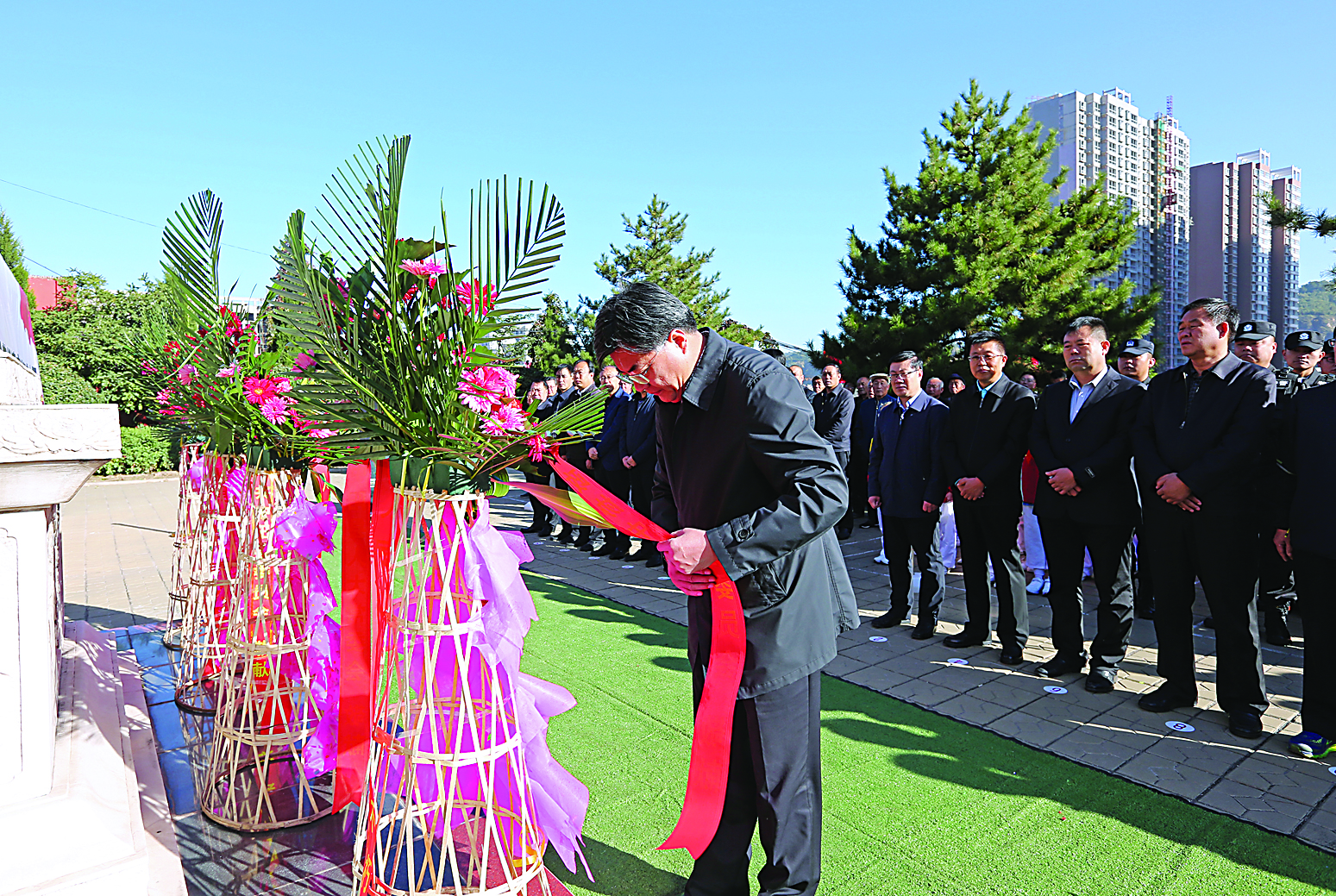 上午9時(shí)整,烈士公祭活動正式開始,中華人民共和國國歌響徹全場,全體人員面向紀(jì)念碑列隊(duì)肅立,向?yàn)橹袊嗣窠夥攀聵I(yè)和共和國建設(shè)事業(yè)英勇獻(xiàn)身的烈士們默哀。默哀完畢,參加活動的少先隊(duì)員們齊聲獻(xiàn)唱《我們是共產(chǎn)主義接班人》并敬少先隊(duì)隊(duì)禮,向革命先烈表達(dá)了繼承光榮傳統(tǒng)、當(dāng)好接班人的遠(yuǎn)大志向。伴隨著激昂深情的旋律,少先隊(duì)員們托起花籃,緩緩走向烈士紀(jì)念碑,將花籃擺放到紀(jì)念碑前。喬曉峰神情肅穆,緩步上前,仔細(xì)整理花籃上的緞帶。全體參祭人員瞻仰革命烈士紀(jì)念碑,深切緬懷革命先烈的豐功偉績,虔誠祭奠革命先烈的不朽英魂,表達(dá)對革命先烈的無限敬仰。