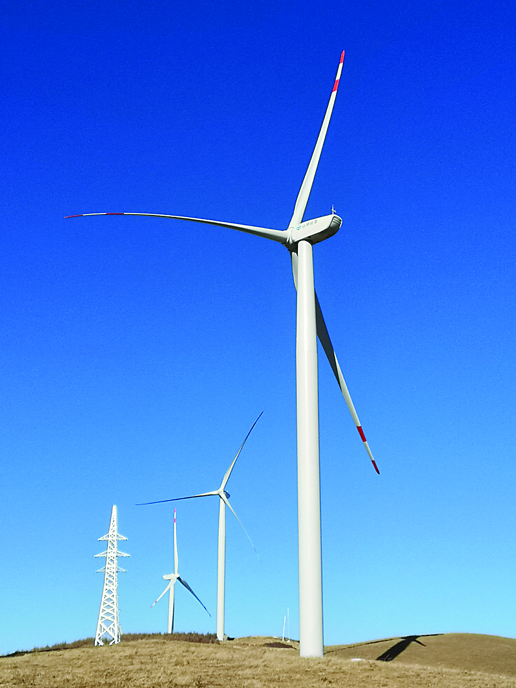 在呂梁骨脊山東麓,華北第二大亞高山草甸---西華鎮(zhèn)四十里跑馬場(chǎng)之巔,連綿的小山崗上,矗立著一個(gè)個(gè)百米之高的大風(fēng)車,形成了一道靚麗而又獨(dú)特的風(fēng)景。這正是協(xié)鑫智慧能源股份有限公司旗下承建的離石云頂山24.9萬(wàn)千瓦風(fēng)電建設(shè)項(xiàng)目。