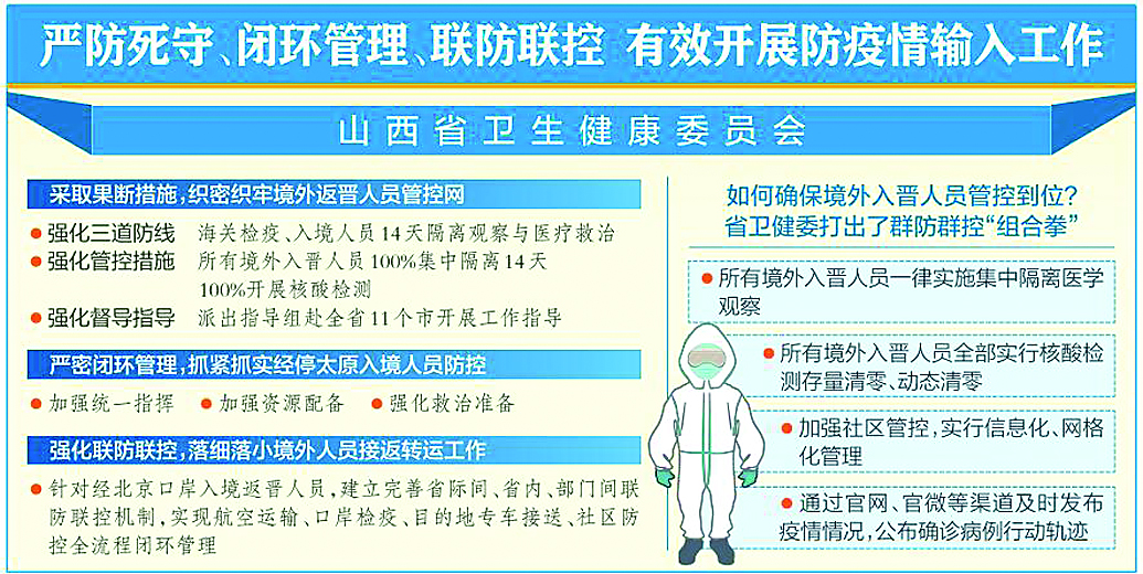 強(qiáng)化聯(lián)防聯(lián)控,落細(xì)落小境外人員接返轉(zhuǎn)運(yùn)工作。針對經(jīng)北京口岸入境返晉人員,建立完善省際間、省內(nèi)、部門間聯(lián)防聯(lián)控機(jī)制,省政府牽頭成立轉(zhuǎn)運(yùn)工作專班,實施24小時值守制度,采取“點對點、一站式”服務(wù),由駐京辦統(tǒng)一安排專車,幫助國外入境返晉人員安全有序返鄉(xiāng)。各市組建工作專班進(jìn)駐太原機(jī)場,配置專車點對點、頭碰頭接運(yùn)返晉人員,實現(xiàn)航空運(yùn)輸、口岸檢疫、目的地專車接送、社區(qū)防控全流程閉環(huán)管理。