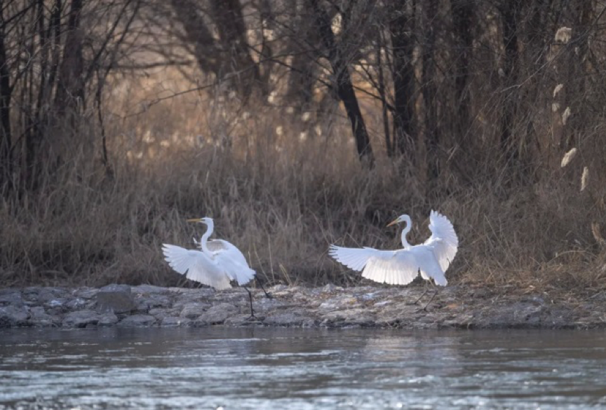 △白鷺在汾河濕地公園內(nèi)嬉戲