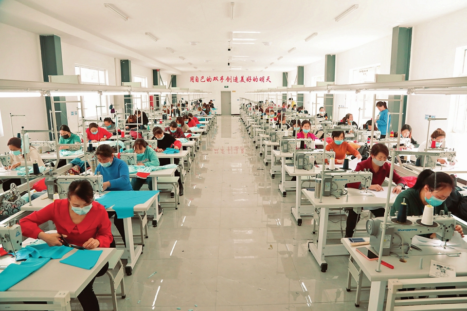 習(xí)近平總書記視察山西,讓興縣廣大群眾備受鼓舞,也進(jìn)一步激發(fā)了貧困群眾的內(nèi)生動(dòng)力。圖為5月14日,興縣龍圣隆扶貧車間,工人們正在趕制一批服裝訂單。 記者李全宏攝