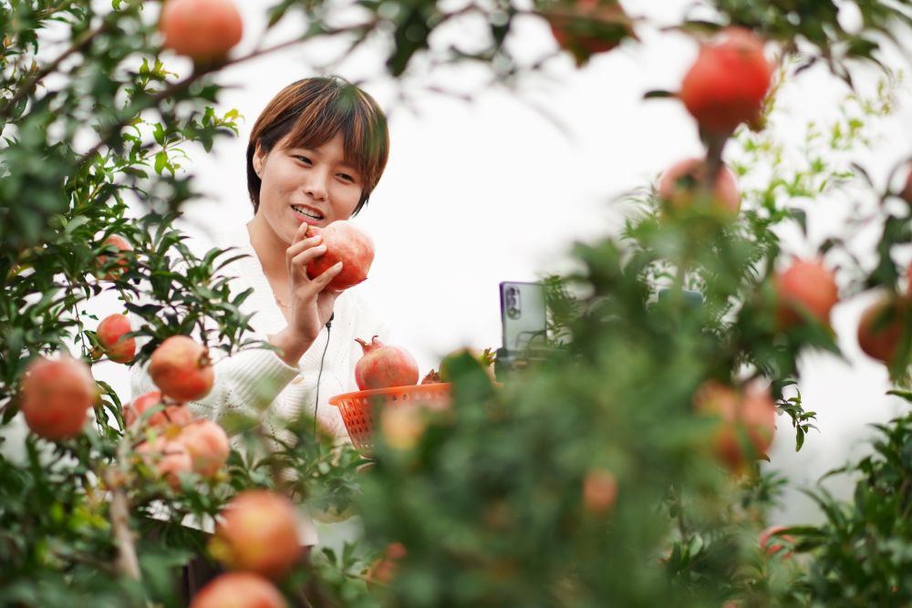 河北省邢臺(tái)市內(nèi)丘縣五郭店鄉(xiāng)東磁窯溝村農(nóng)民在石榴園通過(guò)網(wǎng)絡(luò)直播銷售石榴(10月2日攝)。新華社記者朱旭東攝