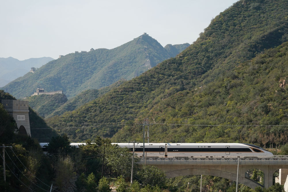 一列復(fù)興號(hào)高鐵列車從京張高鐵駛過(guò)居庸關(guān)長(zhǎng)城(10月6日攝)。新華社記者鞠煥宗攝