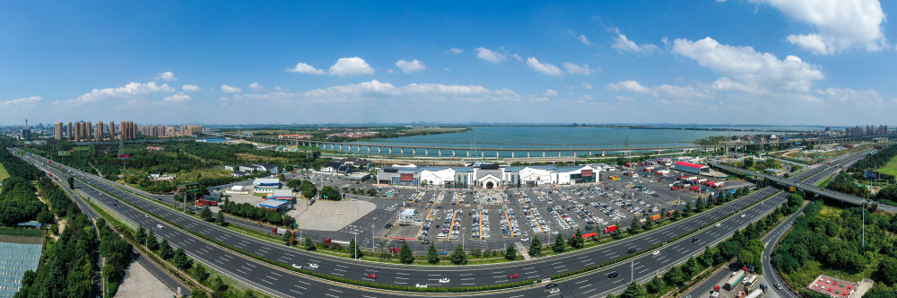 這是滬寧高速公路蘇州段陽(yáng)澄湖服務(wù)區(qū)(10月8日攝,無(wú)人機(jī)全景拼接照片)。陽(yáng)澄湖服務(wù)區(qū)于2019年5月完成升級(jí)改造,通過(guò)大型水景等元素還原“詩(shī)畫江南”意境,成為當(dāng)?shù)氐摹靶戮包c(diǎn)”。新華社記者李博攝