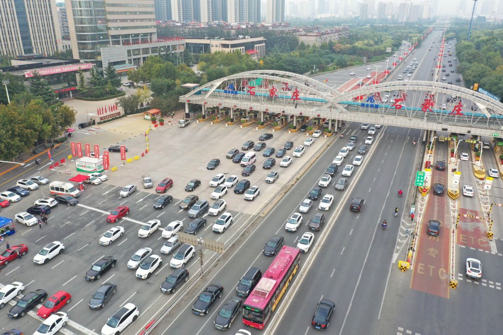 車輛在S9902新元高速石家莊裕華路口通行(10月8日攝,無(wú)人機(jī)照片)。新華社記者朱旭東攝