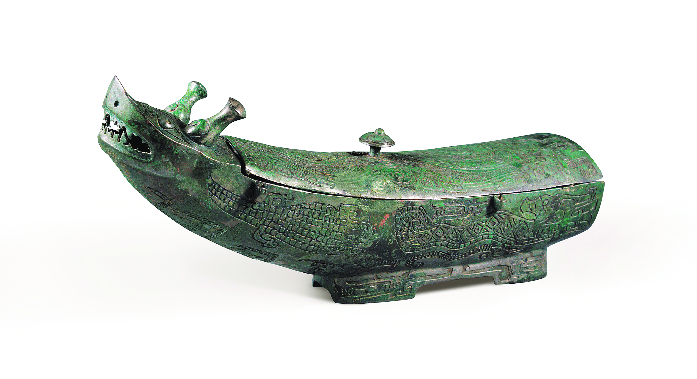 龍形觥從全器形看有些像獸角,前端為龍首形,昂頭翹鼻,口部微張,上下兩排尖尖的鋸齒形牙,利齒畢露,牙齒間隙可注酒,蓋面中央有一蘑菇形鈕,器身口沿外附有兩對(duì)貫耳,用來(lái)把龍形觥吊起加熱酒,另一端沒有封口是用來(lái)散水蒸氣的,器物底部有長(zhǎng)方形矮圈足,放置平穩(wěn),造型獨(dú)特,獨(dú)具風(fēng)采。器身遍飾華麗精美的圖案,蓋面為逶迤的龍身,與器物前端的龍頭相銜接,兩側(cè)裝飾有鱷魚、夔龍。在栩栩如生的紋飾裝點(diǎn)下,龍形觥整體婉如一艘停泊在水波里的龍舟。但最令人費(fèi)解的是,這件出土于山西西部黃河沿岸石樓縣的3000多年前商代的青銅器上,極為罕見出現(xiàn)了鱷魚紋飾,莫非,當(dāng)時(shí)地處黃土高原上石樓縣的氣候溫暖濕潤(rùn),沼澤遍地,鱷魚徜徉?
